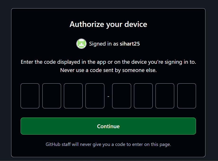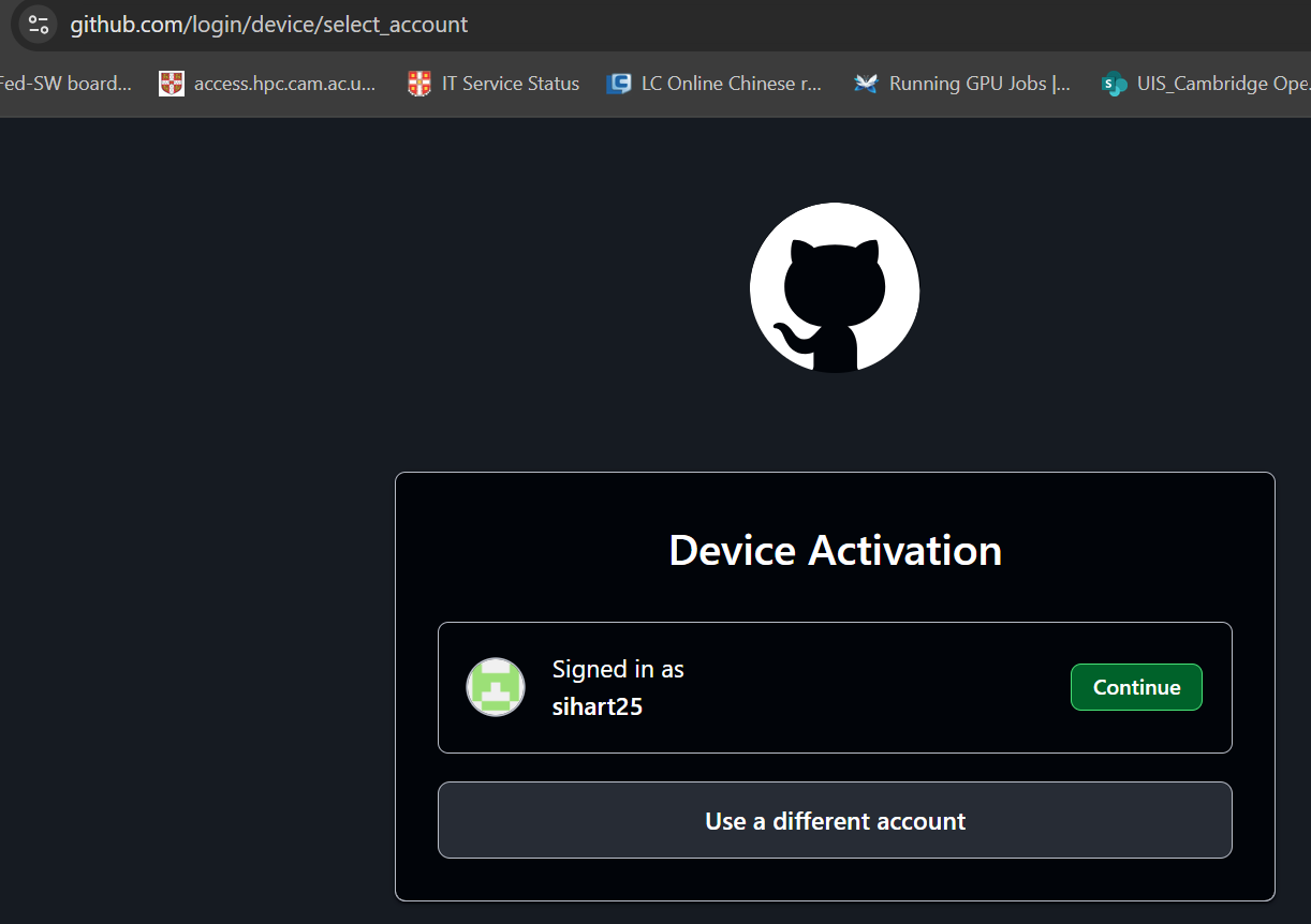 - Copy the URL and open it in your web browser. You will be prompted to sign in with your github.com account to allow the device.