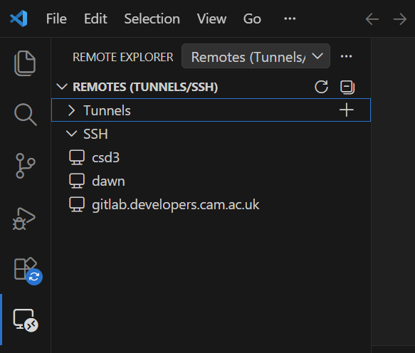 Now you can connect to the Dawn cluster by using the remote explorer in VS Code and selecting dawn from the list of SSH targets. Once connected, you can open a terminal, navigate to your working directory, and start working on the cluster as if you were logged in directly.